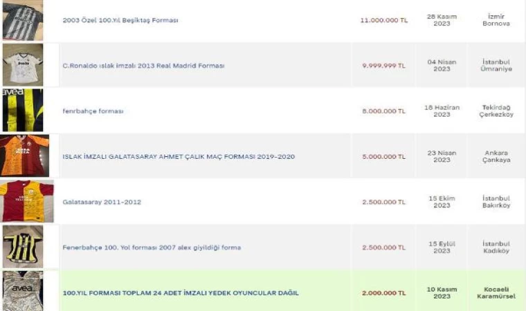 İlanlarda Fenerbahçeli futbolcu Sebastian Szymanski'nin forması 240 milyon liraya satışa sunuldu. Hediye gelen formasını sattığını belirten bir kullanıcı ise 2002'de Galatasaray'da forma giyen futbolcuların imzasının yer aldığı formaya 20 milyon lira talep etti. En pahalı ilanlarda 3'üncü sırada yer alan online alışveriş sitesi kullanıcısı, 6 Nisan 2014'te Galatasaray ile Fenerbahçe arasında oynanan maçta futbolculara imzalattığı sarı kırmızılı forma için 15 milyon lira istedi. Kullanıcının ilanının açıklama bölümüne yazdığı 'Fiyatı hakkında saçma mesaj atanlar ve teklif verenler, bu futbolcuları bulun ve imza attırın. Daha sonra istediğiniz fiyata siz satın' notu dikkati çekti. Bir kullanıcı Beşiktaş'ın kuruluşunun 100'üncü yılındaki forması için 11 milyon lira, diğeri Fenerbahçe'nin kuruluşunun 100'üncü yılında Alex'in giydiği forma için 2 milyon 500 bin lira talep etti. İlanlar arasında 11 Ocak 2022'de trafik kazasında hayatını kaybeden Ahmet Çalık'ın, 2019-2020 sezonunda Fenerbahçe karşılaşmasında oynayan Galatasaraylı futbolcuların imzaladığı forması ise 5 milyon liraya satışa sunuldu. (DHA)