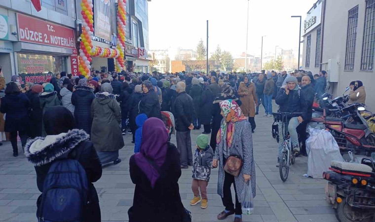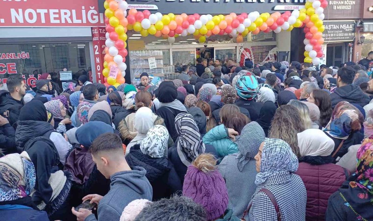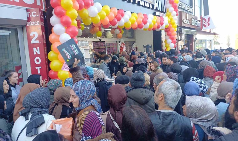 Düzce merkezde bir ucuzluk mağazası açıldı. İlk güne özel olarak "Ne alırsan 100 TL" kampanyası yapan mağaza, bunu sosyal medya hesaplarından da duyurunca vatandaşlar sabahın erken saatlerinden itibaren mağaza önünde yoğunluk oluşturdu. Miting alanına dönen mağaza önündeki kalabalığın içeride izdiham oluşturmaması için işyeri sahipleri kapıları kapatarak müşterileri içeriye sırayla aldı. Ancak sabahın erken saatlerinde itibaren mağaza önünde bekleyen müşteriler, zaman zaman işyeri çalışanlarıyla ve birbirleriyle tartıştı.