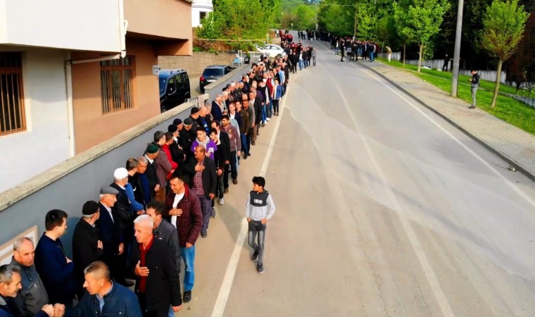 Bursa İnegöl’de Cerrah Mahallesi sakinleri, geleneksel hale gelen toplu bayramlaşma için yaklaşık 1 kilometrelik kuyruk oluşturdu.