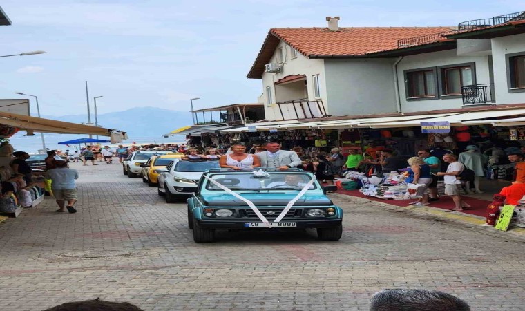Marmaris’e 21 kilometre mesafedeki Turunç Mahallesi’nde hem mahalleliler hem de yıllardır yabancı düğün organizasyonları yapan firma sahibini şaşırtan bir tören yaşandı. İngiltere’de nikahlarını kıydırdıktan sonra damat Sean Prenderville’nin birkaç yıl önce Turunç’a yerleşen ailesi ile birlikte düğün yapmak istemesi ile Türkiye’ye gelen İngilizler Türk bayrağı ve davul zurna eşliğinde önce kaldığı otelden gelini aldı, sonra yine otelin önündeki meydanda mahalle sakinleri ve yakınlarının alkışları ile davul zurna eşliğinde göbek attı. Sonrasında ise arabalara binilip konvoyla düğünün yapılacağı otele geçildi.