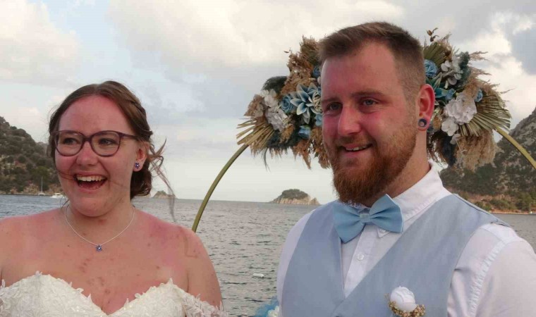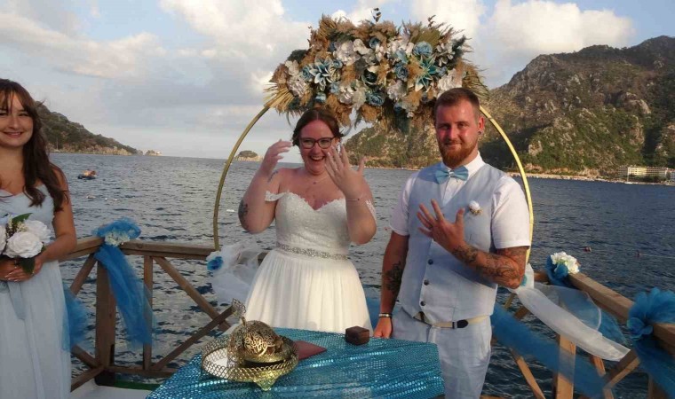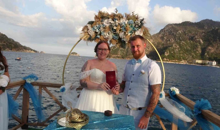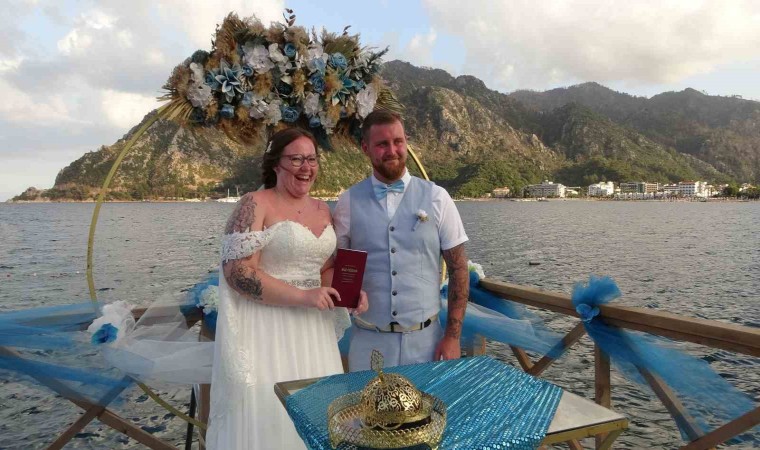 Marmaris’e 11 kilometre mesafedeki İçmeler Mahallesi plajında düzenlenen İngiltere’den gelin damadın aileleri ve arkadaşlarının katılımı ile düzenlenen nikah merasiminde 5 yıllık arkadaşlıklarını evlilik ile taçlandıran genç çift, birlikte çıktıkları ilk tatil olduğu için burada evlenmeyi tercih ettiklerini belirttiler. Babasının kolunda nikah masasına gelen gelini gören damat mutluluk gözyaşlarını tutamazken gelin Kate’in şen kahkahaları, arkadaşları ve ailelerini de mutlu etti.