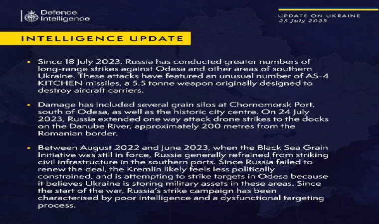 İngiltere Savunma Bakanlığı tarafından Rusya-Ukrayna savaşına dair yayımlanan günlük istihbarat raporunda, Rusya’nın, Tahıl Anlaşması’ndan ayrılmasının ardından Odesa'ya ve Ukrayna'nın güneyindeki diğer bölgelere saldırılarının arttığı belirtildi.