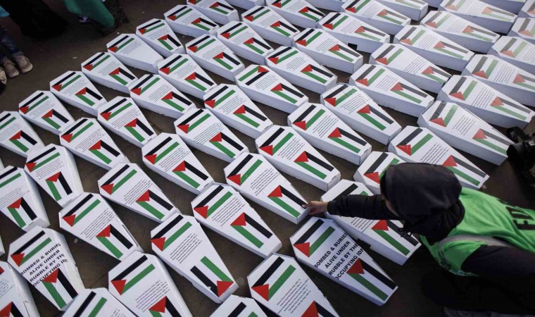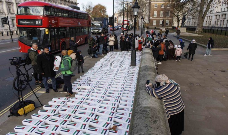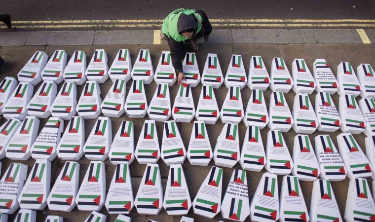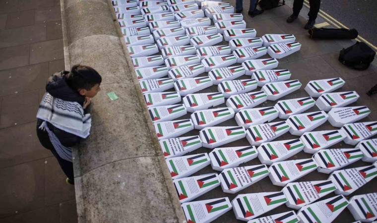 İngiltere’nin başkenti Londra’da Başbakanlık Konutu’nun yakınına İsrail saldırılarında Gazze Şeridi’nde hayatını kaybeden çocukların anısına 450’den fazla sembolik çocuk tabutu bırakıldı.