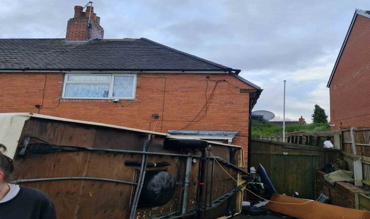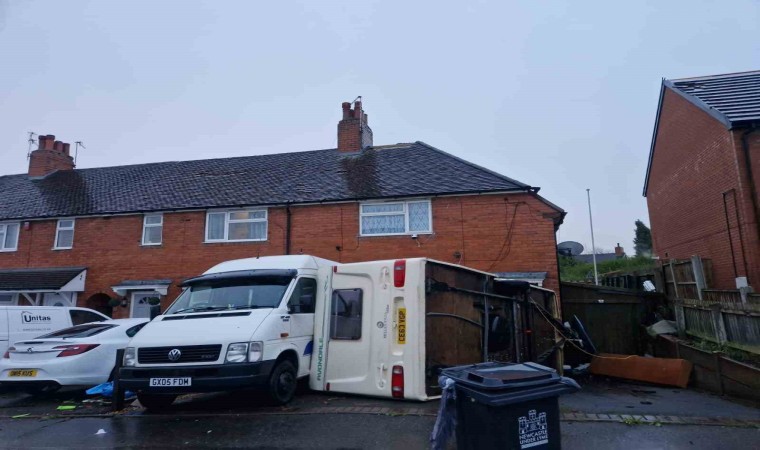 İngiltere’nin Staffordshire bölgesindeki Knutton köyünde dün yerel saatle 06.30 sıralarında fırtına meydana geldi. Şiddetli rüzgar nedeniyle çöp kutuları ve çatılar uçtu, ağaçlar devrildi, evlerin pencerelerinde, araçlarda hasar meydana geldi. Park halindeki bir karavanın devrilme anı ise güvenlik kamerasına yansıdı. Görüntüde aniden başlayan fırtınada karavanın devrilerek yanındaki minibüse çarptığı görüldü.