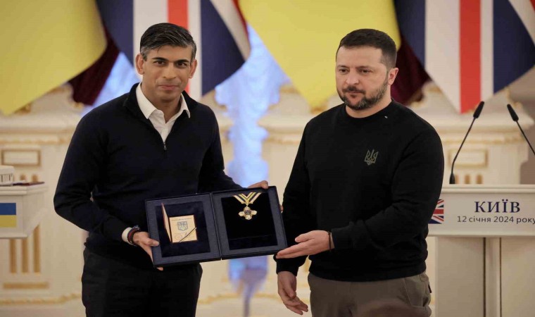 İngiltere Başbakanı Rishi Sunak, bugün Ukrayna’yı ziyaret etti. Başkent Kiev’de bir araya gelen Sunak ve Ukrayna Devlet Başkanı Vladimir Zelenskiy, görüşmenin ardından Kiev’e 2,5 milyar sterlin değerinde askeri destek taahhüdünü içeren güvenlik anlaşmasına imza attı. Anlaşmanın ardından iki lider basın toplantısına geçerken, Zelenskiy toplantının başında Sunak’a “Özgürlük Nişanı” takdim etti. Zelenskiy’e teşekkür eden Sunak, “Bugün, yarın, (savaş) ne kadar sürerse sürsün yanınızdayız. Ukrayna asla yalnız kalmayacak” dedi.