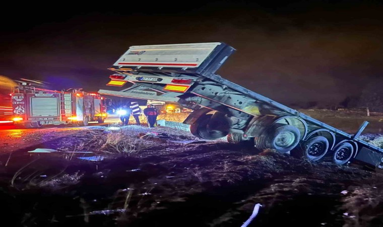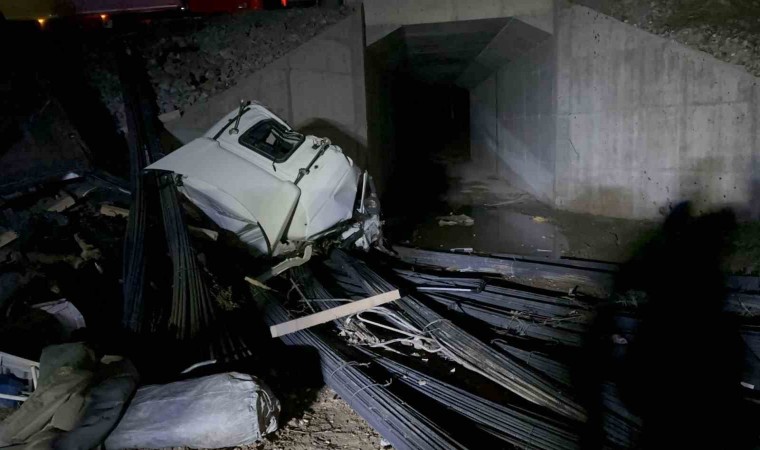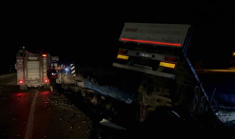Afyonkarahisar’da inşaat demiri yüklü tır arıza nedeniyle yol kenarında bekleyen bir başka tıra çarpıp yüksekliği yaklaşık 3 metre olan menfezden aşağı uçarken, olayda 1 kişi yaralandı.