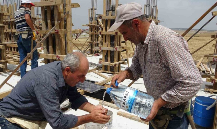 Sabah saatlerinde mesailerine başlayan inşaat işçileri, sıcaklığın daha fazla hissedildiği öğle saatlerinde de çalışmaya devam ediyor. İşçiler, başlarına şapka, bez takarak sıcaklıktan korunmaya çalışıyor. İşçilerin soğuk su içerek ve başlarına su dökerek serinlemeye çalışıyor.