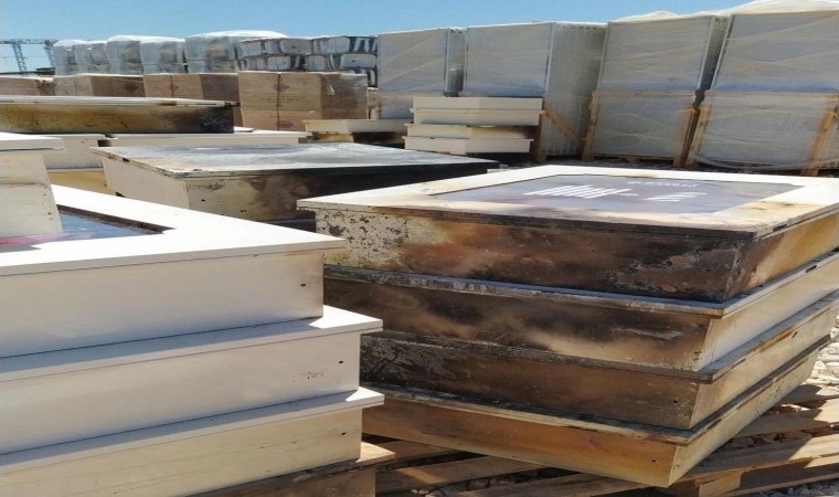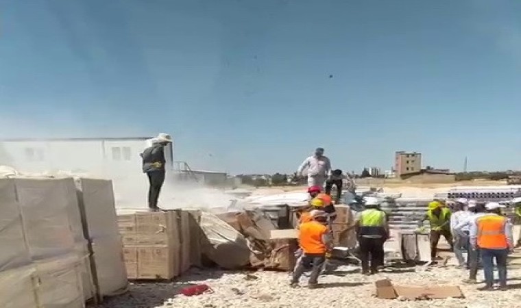 Adıyaman’da, devam eden kalıcı deprem konutları için alınan inşaat malzemeleri alev alarak yandı.