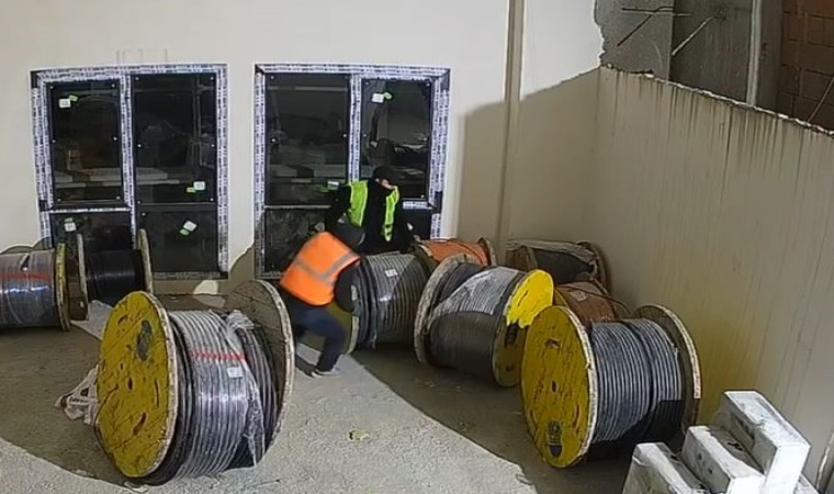 Görüntülerde hırsızların inşaata girip dev kablo rulolarını çaldıkları görülüyor.