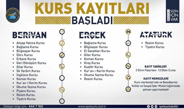 İpekyolu Belediyesinden yapılan açıklamada, “Sosyal belediyecilik çerçevesinde İpekyolu Halk Eğitim Merkezi Müdürlüğünün katkıları ile İpekyolu Belediyesi Kültür ve Sosyal İşler Müdürlüğünün koordinasyonunda düzenlenen sanat ve mesleki eğitim kursları hemşerilerimize ücretsiz olarak veriliyor. Kültür ve Sosyal İşler Müdürlüğüne bağlı Erçek Yaşam Merkezi, Berivan Kültür ve Sanat Merkezi, Atatürk Sanat Galerisi’ndeki kursları çeşitli branşlarla hizmet vermeye devam ediyor. Erçek Yaşam Merkezimizde; keman, resim, kuaförlük, kreş, el sanatları, okuma yazma, Kuran’ı Kerim, bağlama, bilgisayar ve gitar kursları verilirken, Berivan Kültür ve Sanat Merkezimizde; piyano, gitar bağlama, ahşap yakma, resim, İngilizce, ebru sanatı, bilgisayar, keman, erbane, geri dönüşüm, Kuran’ı Kerim, karakalem, ilk yardım, tiyatro ve okuma yazma kursları veriliyor. Ayrıca Atatürk Sanat Galerisi’nde de resim ve tiyatro branşlarında kurslarımız yer alıyor. Kurslardan faydalanmak isteyen hemşerilerimiz 2-13 Ekim 2023 tarihleri arasında kurs merkezlerimize ve belediyemizin Kültür ve Sosyal İşler Müdürlüğüne giderek kimlik fotokopisi ile şahsen kayıt yaptırabilirler. Vatandaşların kültürel, sanatsal ve sosyal gelişimini destekleyen kurslarla her kesime hitap eden sosyal belediyecilik anlayışıyla hizmetlerine devam edecek” denildi.