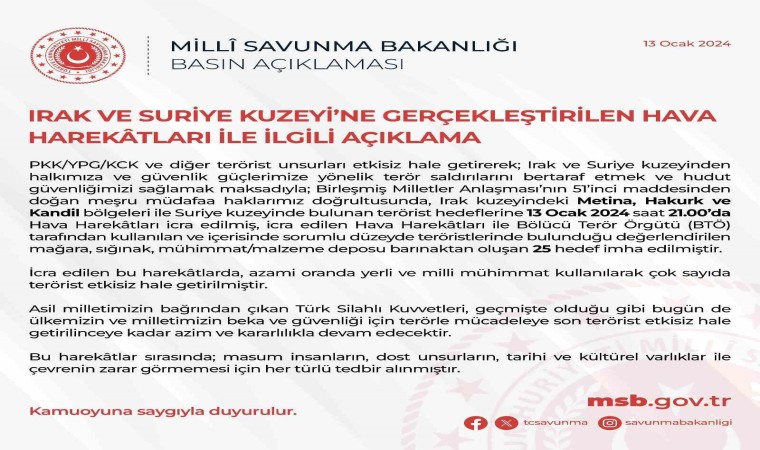 Milli Savunma Bakanlığı, Irak’ın ve Suriye’nin kuzeyindeki terörist hedeflere yönelik düzenlenen hava harekatında 25 hedefin imha edildiğini, çok sayıda teröristin etkisiz hale getirildiğini açıkladı.