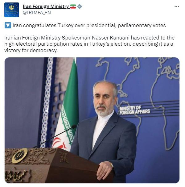 İran Dışişleri Bakanlığı Sözcüsü Kanaani, “Yüksek seçmen katılımı Türkiye'de Pazar günü yapılan cumhurbaşkanlığı ve parlamento seçimleri ve oylamaların başarıyla gerçekleştirilmesi, demokrasi için bir zafer işaretidir” dedi. Kanaani, Türk halkını ve siyasi partileri tebrik etti.
