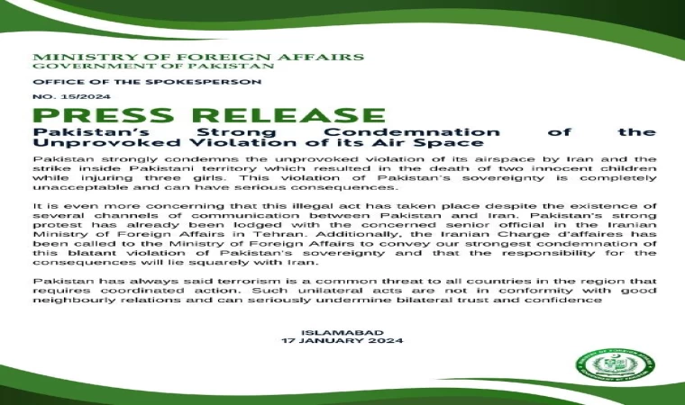Pakistan Dışişleri Bakanlığı’ndan yapılan açıklamada, “Pakistan, İran tarafından hava sahasının sebepsiz yere ihlal edilmesini ve Pakistan toprakları içerisinde gerçekleştirilen ve 2 masum çocuğun ölümü, 3 kız çocuğunun da yaralanmasıyla sonuçlanan saldırıyı şiddetle kınamaktadır. Pakistan'ın egemenliğinin bu şekilde ihlal edilmesi hiçbir şekilde kabul edilemez ve ciddi sonuçlar doğurabilir” denildi.