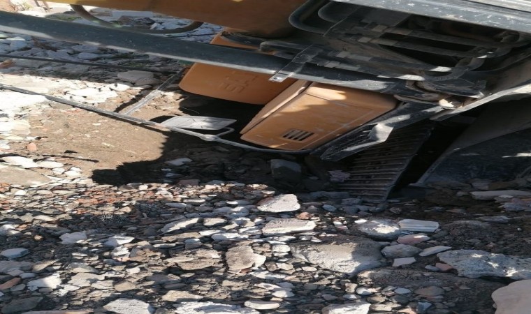 Depremin vurduğu Hatay’da bir iş makinası, yıkım esnasında oluşan yarığın içerisine düştü.