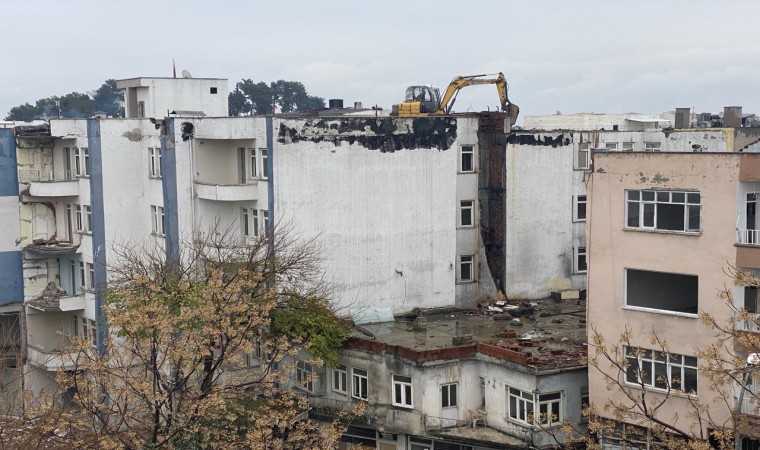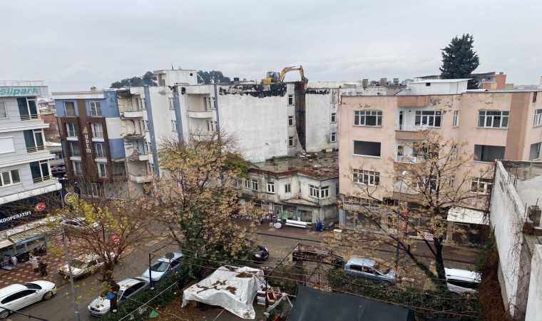 Adıyaman’da 6 Şubat depreminde ağır hasar alan 5 katlı binanın üzerine çıkarılan iş makinesi, yıkıma üstten başladı.