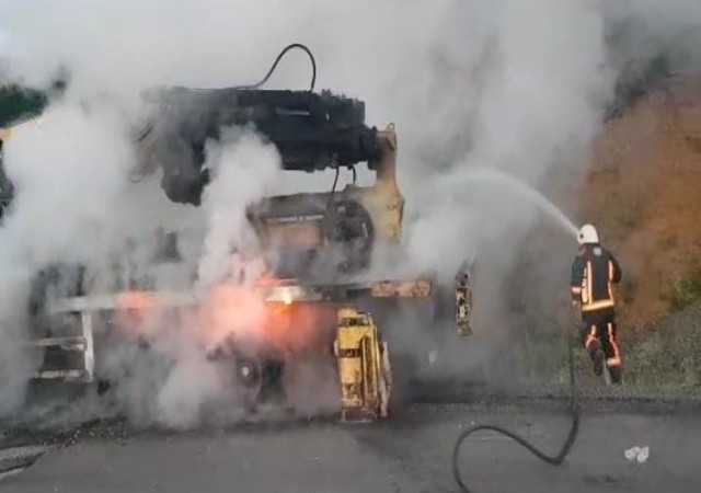 İş makinesi taşıyan çekici seyir halindeyken alev aldı