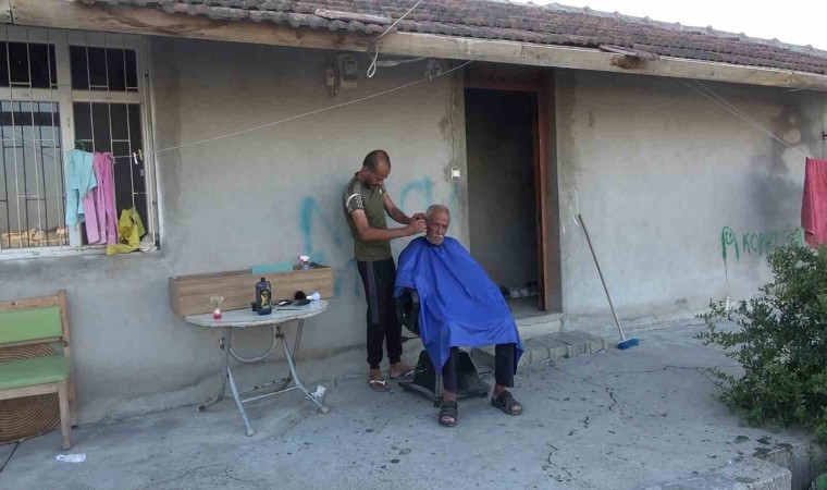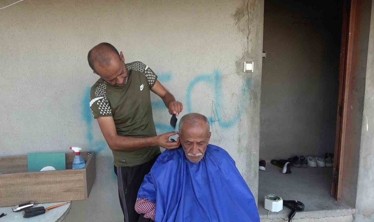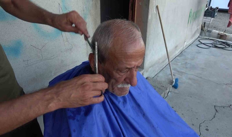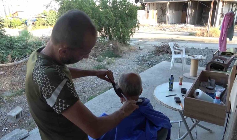 Hatay’ın Antakya ilçesinde depremde evi ağır hasar alan ve iş yeri yıkılan berber Gazi Gümüş, işini evinin önünde devam ettiriyor.