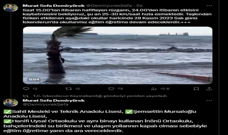 İskenderun Kaymakamı Mehmet Sefa Demiryürek, ilçede 4 okulda eğitime bir gün ara verildiğini duyurdu. Kaymakam Demiryürek, sosyal medya hesabında yaptığı paylaşımda, “Sahil Mesleki ve Teknik Anadolu Lisesi, Şemsettin Mursaloğlu Anadolu Lisesi, Hanifi Uysal Ortaokulu ve aynı binayı kullanan İnönü Ortaokulu, bahçelerindeki su birikmesi ve ulaşım yollarının kapalı olması sebebiyle eğitim öğretime yarın da ara vereceklerdir” dedi.