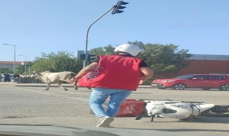 İskenderun’da başıboş dolaşan büyükbaş hayvan, trafikte ilerleyen motosikletli kuryeye çarptı. Çarpmanın etkisiyle kurye yere düştü.