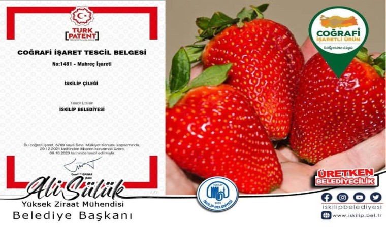 Konuya ilişkin olarak açıklamada bulunan Belediye Başkanı Ali Sülük, “2011 yılında İlçe Tarım Müdürü iken Kaymakamlığımızın destekleriyle başlatmış olduğumuz modern çilek üretimi kısa sürede dağlık bir arazi ve çorak topraklara sahip birçok köyümüzün kaderini değiştirmişti. İskilip çileği, ciddi anlamda ülkemizin talebini karşılamakta ve üretimde önemli bir noktaya gelmiştir. Üretken belediyecilik anlayışı ile çıktığımız bu yolda ilçemize has ürünlerin markalaşması ve yöresel ürünlerimizin tanıtımı için Basın Yayın ve Halka İlişkiler Müdürlüğümüzün girişimleriyle 2021 yılında İskilip çileğimizin Coğrafi İşaret alabilmesi için yapılan çalışmalar nihai sonuca ulaştı. Başvurumuz Türk Patent ve Marka Kurumu tarafından olumlu sonuçlanarak 29 Aralık 2021 tarihinden itibaren korunmak üzere, belediyemiz tarafından ilçemiz adına 6 Ekim 2023 tarihinde İskilip çileği olarak tescillenmiştir. Belediyemizce yürütülen çalışmalar çerçevesinde ilçemize özgü iki ürünümüzün başvurusu devam etmektedir. Emeği geçen herkese ve personellerime teşekkür ederim" dedi.