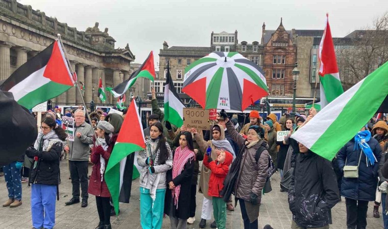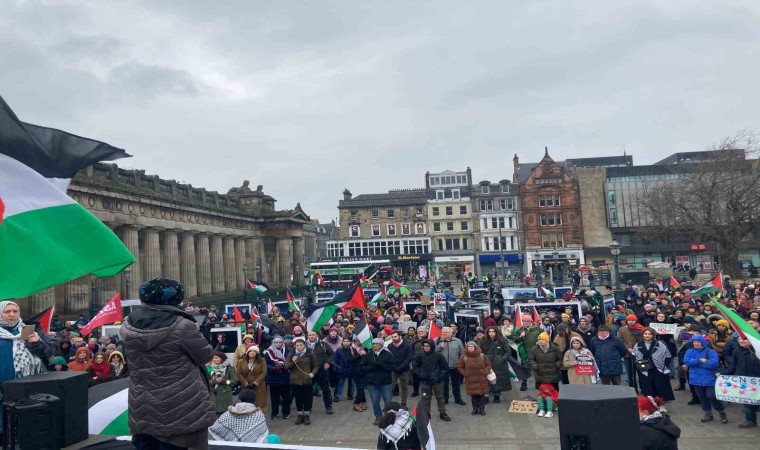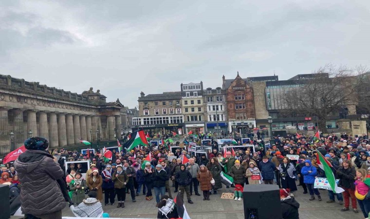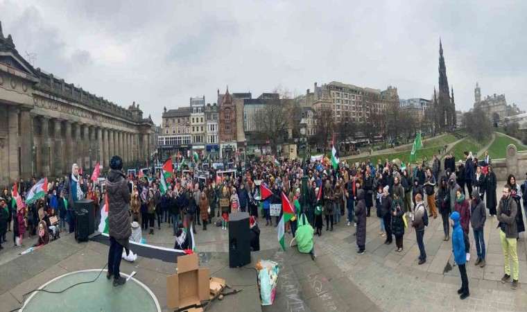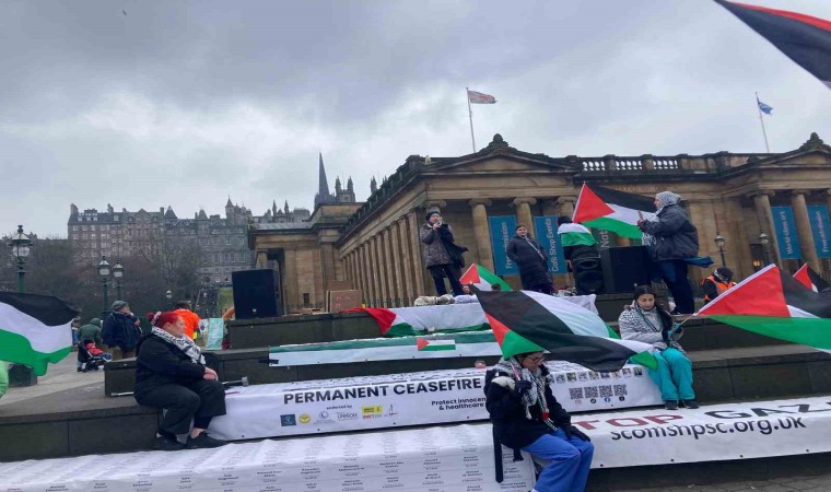 İskoçya’nın başkenti Edinburgh’ta toplanan Filistin destekçileri, Gazze’de acil ateşkes sağlanması için protesto gösterisi düzenledi.