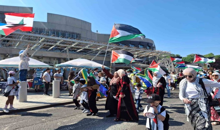 İskoçya’da binlerce kişi Filistin’e destek için düzenlenen yürüyüşlere devam ediyor. Başkent Edinburgh’taki Waverley Tren İstasyonu önünde toplanan yaklaşık 10 bin kişi Filistin’e özgürlük”, “Gazze için hemen barış”, “Barış sağlanana kadar meydanlardayız”, Gazze biz seni asla yalnız bırakmayacağız” sloganları attı. İskoçya parlamentosuna doğru yürüyen Filistin destekçileri, İrlanda ve Filistin bayrakları sallayarak İsrail’e tepki gösterirken, Güney Afrika bayrakları da dikkat çekti.