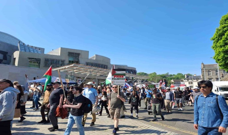 İskoçya’nın başkenti Edinburgh’ta Filistin’e destek için toplanan yaklaşık 10 bin kişi İsrail’e tepki gösterirken, Gazze Şeridi’nde “Barış sağlanan kadar meydanlardayız” sloganları attı.
