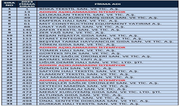 İstanbul Sanayi Odası (İSO) tarafından gerçekleştirilen, “Türkiye’nin İkinci 500 Büyük Sanayi Kuruluşu-2023 Araştırması” sonuçlarına göre Gaziantep’ten 33 firma listede yer aldı.