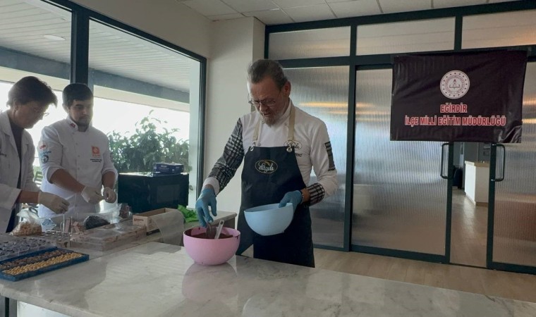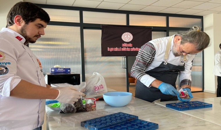 Isparta’nın meşhur gülü ve Eğirdir’in ünlü elmasıyla hazırlanan çikolata, Eğirdir Nafiz Yürekli Turizm Meslek Lisesi’nde düzenlenen etkinlikte öğretmenlerin beğenisine sunuldu. Eskişehirli bir çikolata ustası, 24 Kasım Öğretmenler Günü dolayısıyla katıldığı etkinlikte, bu özel lezzetin yapımını uygulamalı olarak anlatarak Isparta’da daha önce yapılmamış gül ve elma aromalı çikolatayı yaptı.