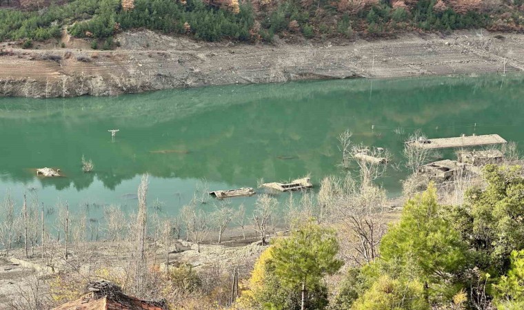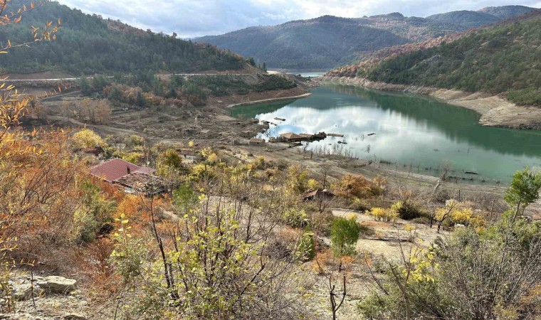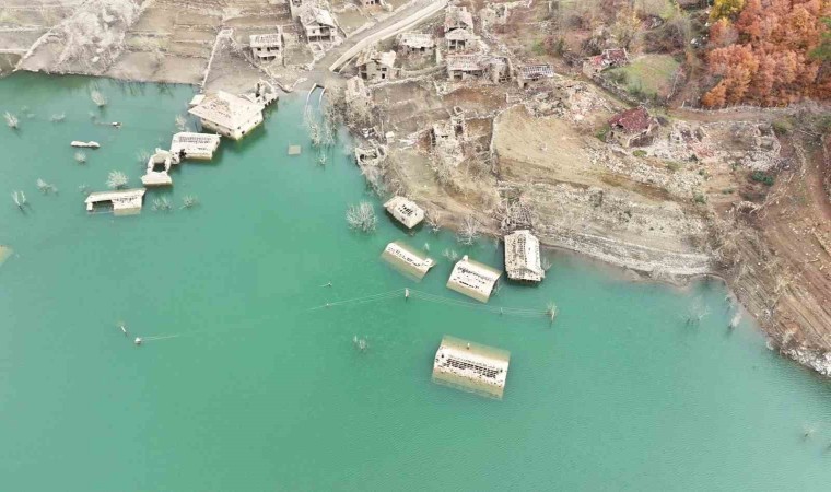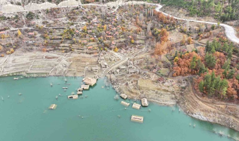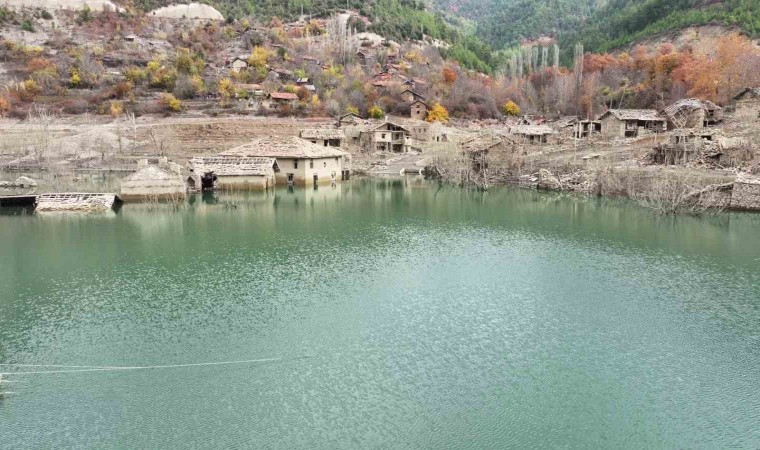 Isparta’nın Sütçüler ilçesindeki Darıbükü köyünde suların çekilmesiyle gün yüzüne çıkan eski evler seyirlik görüntü oluşturuyor.
