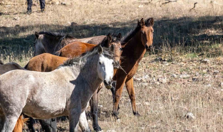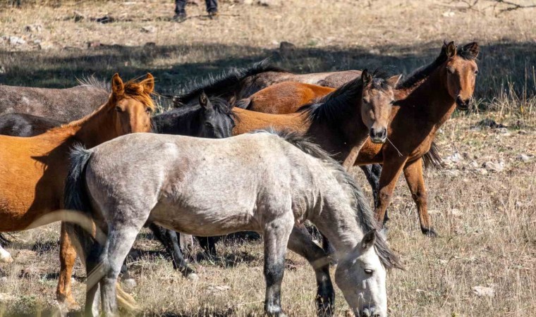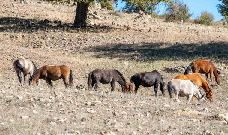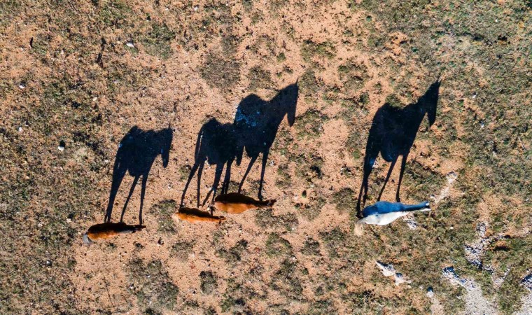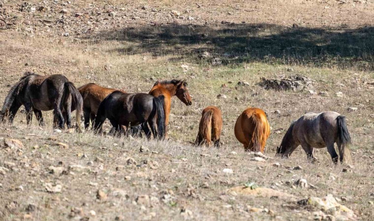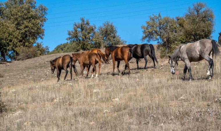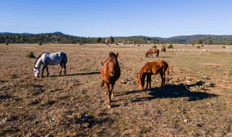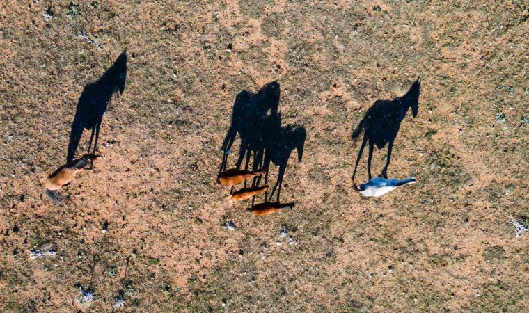 Isparta’nın Eğirdir ilçesindeki Adada Antik Kenti’nde serbestçe dolaşan 12 yılkı atı, dronla görüntülendi.