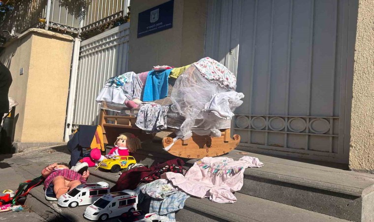 Başkentte bir grup vatandaş, İsrail Büyükelçiliği’nin önünde toplanarak çocuk oyuncağı bıraktı.