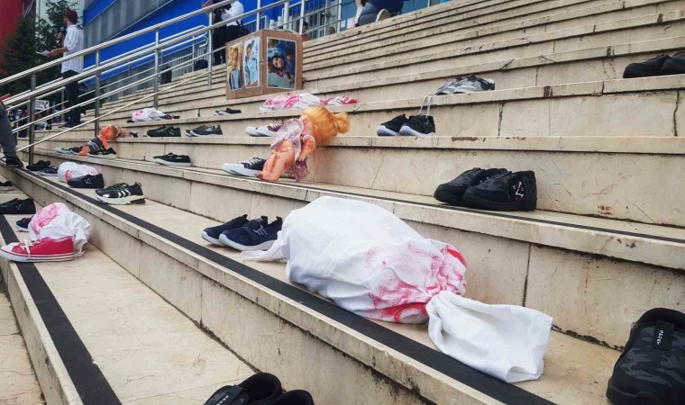İsrail’in bebek ve çocuk ayrımı yapmadan katliam yapması fakülte merdivenlerine konulan bebek, ayakkabı ve kefenlerle protesto edildi.