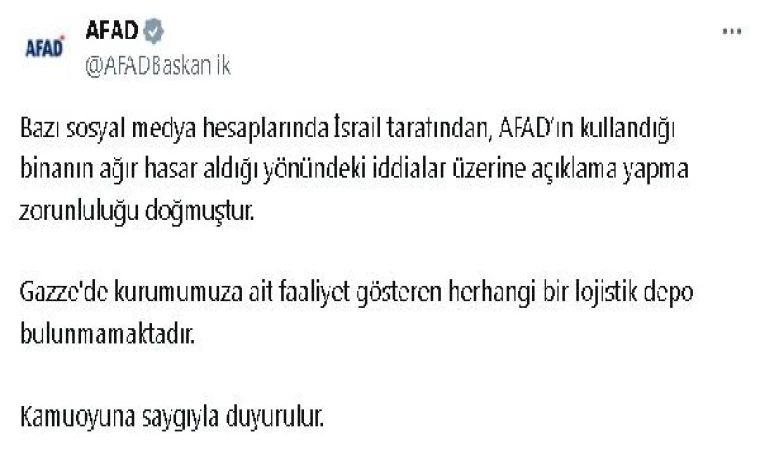 Afet ve Acil Durum Yönetimi Başkanlığı (AFAD) da yıkılan binanın AFAD'a ait olduğu iddialarının doğru olmadığını, Gazze'de AFAD'a ait herhangi bir lojistik deponun bulunmadığını açıkladı. AFAD'ın sosyal medya hesabından yapılan paylaşımda, "Bazı sosyal medya hesaplarında İsrail tarafından, AFAD’ın kullandığı binanın ağır hasar aldığı yönündeki iddialar üzerine açıklama yapma zorunluluğu doğmuştur. Gazze'de kurumumuza ait faaliyet gösteren herhangi bir lojistik depo bulunmamaktadır. Kamuoyuna saygıyla duyurulur" ifadelerine yer verildi. (DHA)