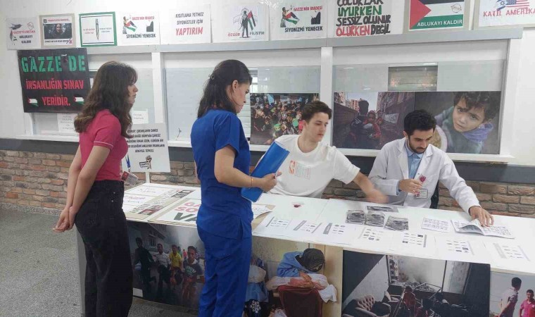 Tekirdağ’da tıp fakültesi öğrencileri, İsrail’in Gazze’deki katliamlarını protesto etmek amacıyla hastaneye gelen vatandaşlara İsrail ürünlerinin yazılı olduğu listeyi dağıtmaya başladı.