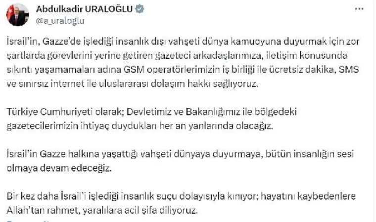 Bakan Uraloğlu, soysal medya hesabından yaptığı açıklamada, "İsrail'in, Gazze'de işlediği insanlık dışı vahşeti dünya kamuoyuna duyurmak için zor şartlarda görevlerini yerine getiren gazeteci arkadaşlarımıza, iletişim konusunda sıkıntı yaşamamaları adına GSM operatörlerimizin iş birliği ile ücretsiz dakika, SMS ve sınırsız internet ile uluslararası dolaşım hakkı sağlıyoruz. Türkiye Cumhuriyeti olarak; devletimiz ve bakanlığımız ile bölgedeki gazetecilerin ihtiyaç duydukları her an yanlarında olacağız. İsrail'in Gazze halkına yaşattığı vahşeti dünyaya duyurmaya, bütün insanlığın sesi olmaya devam edeceğiz. Bir kez daha İsrail'i işlediği insanlık suçu dolayısıyla kınıyor; hayatını kaybedenlere Allah'tan rahmet, yaralılara acil şifa diliyoruz" ifadelerini kullandı. (DHA)