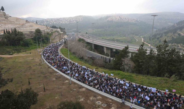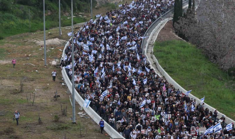 İsrail’in Gazze Şeridi sınırında yer alan Re’im kasabasında toplanan binlerce kişi, esir anlaşması talebiyle Kudüs’teki Başbakanlık Konutu’na yürüyor.