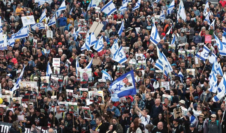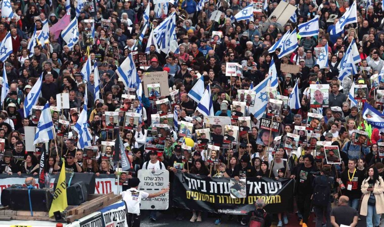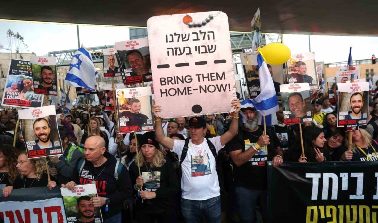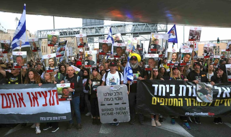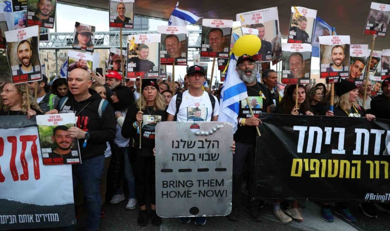 İsrail’de esir protestoları ve Başbakan Binyamin Netanyahu’ya tepkiler sürüyor. Gazze Şeridi’nde esir tutulanların yakınları ve onlara destek vermek isteyen binlerce kişi Gazze Şeridi sınırında yer alan Re’im kasabasında toplanarak Kudüs’teki Başbakanlık Konutu’na yürüyüş başlattı. Hükümetten esir anlaşması talep eden göstericiler, üstünde esirlerin fotoğraflarının olduğu “onları hemen evlerine geri getirin” yazılı pankartlar taşıyarak Netanyahu hükümetine tepki gösterdi.