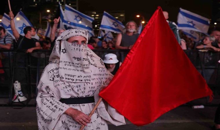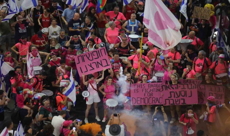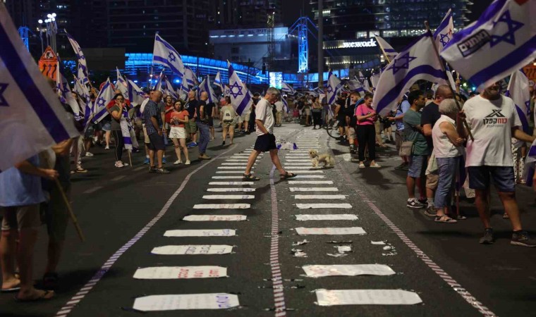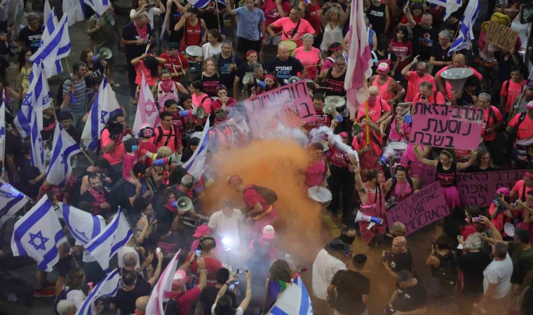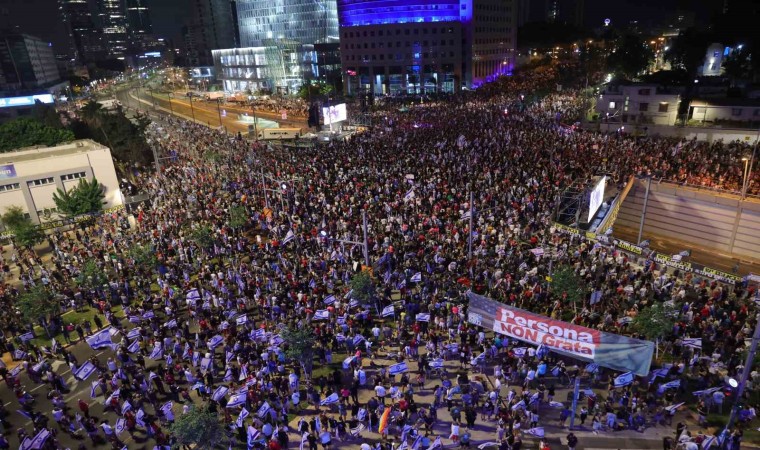 İsrail’de tartışmalı yargı reformuna karşı protestolar 33. haftasında da devam ediyor. Başkent Tel Aviv olmak üzere İsrail’in birçok kentinde on binlerce kişi Başbakan Binyamin Netanyahu’nun yargı reformuna karşı çıkmak üzere sokaklara döküldü. Tel Aviv’de bulunan Kaplan Caddesi’ndeki protestolar, İsrail’in Eurovision Şarkı Yarışması birincisi Netta Barzilai’nin İsrail’in milli marşı “Hatikva”yı seslendirmesiyle başladı. İsrail bayrakları taşıyarak yürüyüş yapan protestocular, pankartlar, davullar, düdükler ve kornalarla Başbakan Netanyahu’ya tepki gösterdi. Sloganlar atan İsrailliler hükümetin yargı reformu talebini eleştirdi.