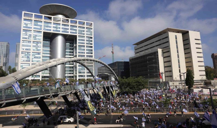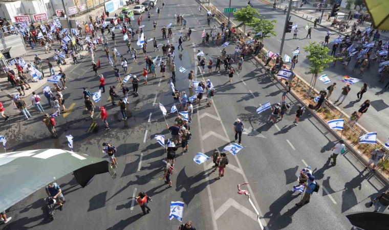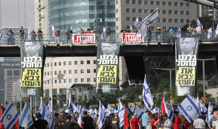 İsrail’de hükümetin yargı reformu paketine karşı protestolar sürüyor. Başkent Tel Aviv’de binlerce kişi ellerinde İsrail bayrağı ile hükümetin yargı politikalarını eleştirmek için toplandı. Tel Aviv’de bir araya gelen binlerce kişi yolları kapattı, metro istasyonlarında büyük kalabalıklar oluştu. Protestocuların bir kısmı Tel Aviv’in merkezindeki İsrail ordusunun askeri karargahı olan Kirya’nın girişlerinden birini kapattı. Bazı protestocular da sis bombası kullanıp davul çalarak “ulusumuzu kurtarın” ve “diktatörlük ekonomimizi öldürecek” sloganları attı. Protestocular, Netanyahu’ya karşı “istenmeyen adam” pankartları taşıdı.
