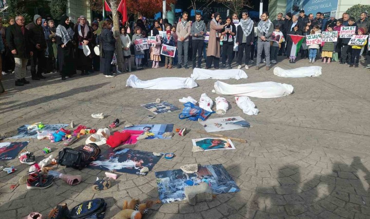 Tekirdağ’ın Süleymanpaşa ilçesinde İsrail’in çocuklara yönelik saldırılarına dikkat çekilmesi amacıyla yerde yatan çocukların üstü beyaz örtüyle kapatılarak İsrail aleyhinde eylem gerçekleştirildi.