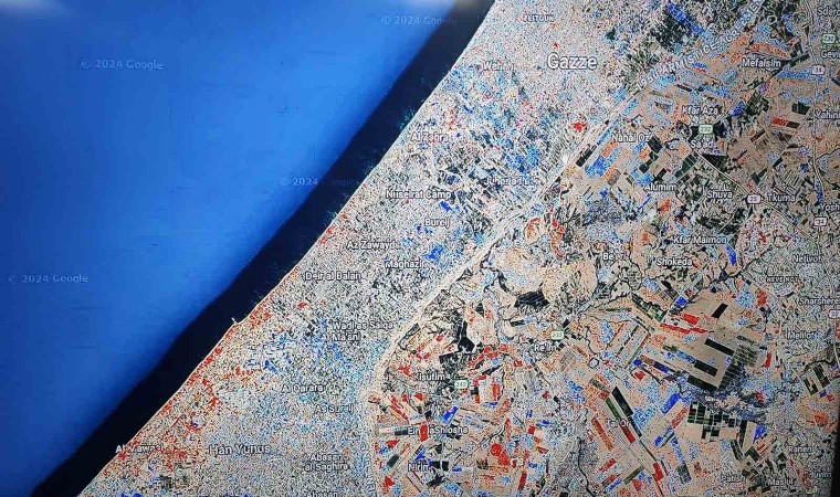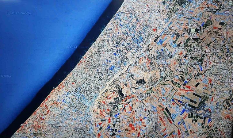 İsrail’in geçen yıl Ekim ayından bu yana Filistin’e yönelik saldırılarının meydana getirdiği tahribatı; geliştirdikleri yazılım ile inceleyen Kutoğlu, "Radar uydu verilerinden yararlanarak dünya çapında yeryüzündeki küresel değişimleri izleyebiliyoruz. Geliştirdiğimiz uygulamanın adına küresel yer izleme sistemi adını verdik. Bu anlamda dünyanın neresinde olursa olsun geçmişe dönük olarak değişimleri izleyebiliyoruz. Yaklaşık bir seneden beri Gazze’de yoğun bir saldırı var. Adil olmayan bir savaş yürütülüyor. Gazze bölgesi yerleşim sivil alanları bombardımana uğruyor. Biz de ’Acaba burada tahribatın boyutları nedir’ diyerek geliştirdiğimiz uygulamayla incelemek istedik. Baktığımızda geçtiğimiz sene Ekim ayından bu yana gelişen süreçte Gazze’nin bütün bir alt ve üst yapısının hemen hemen yüzde 90’ına yakınının hasar aldığını gördük. Burada değerlendirmeye baktığımız zaman mavi ile işaretlenmiş alanlar daha önce orada var olan kütlelerin artık yok olduğunu gösteriyor. Kırmızı alanlar da daha önceden var olmayan kütlelerin yeri oluştuğunu gösteriyor" dedi.