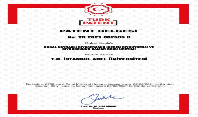 Mühendislik Fakültesi Öğretim Üyesi Doç. Dr. Yeşim Müge Şahin, Meslek Yüksek Okulu Öğretim Görevlisi Erdi Buluş ve Moleküler Biyoloji ve Genetik Bölümü öğrencisi Atahan Çelik tarafından geliştirilen sağlık, gıda, tarım, otomotiv, hava filtrasyon ve savunma sanayi gibi geniş bir uygulama alanına sahip olan “Doğal Kaynaklı Biyoseramik İçeren Biyouyumlu ve Biyobozunur Damar Doku Üretimi” buluşu tescillenerek patent almayı başardı.