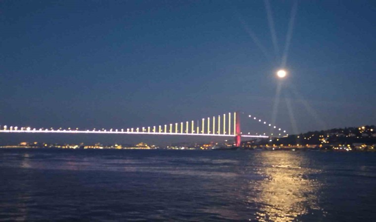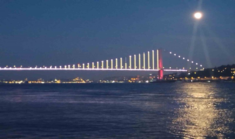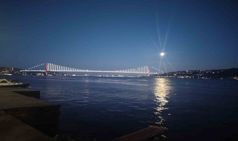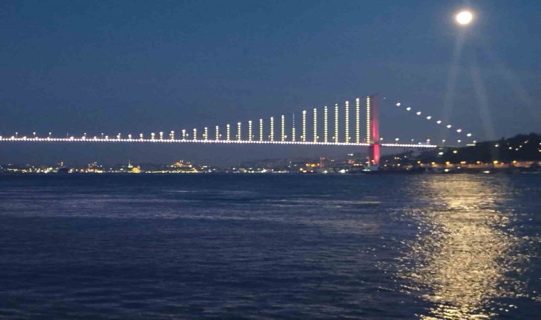 İstanbul Boğazı’nda dolunay, 15 Temmuz Şehitler Köprüsü ile birlikte görsel şölen oluşturdu.