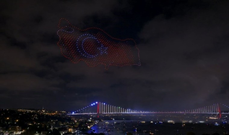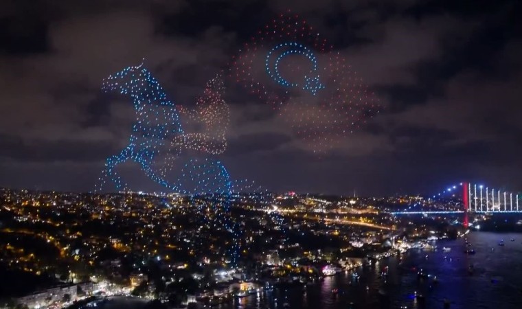 İstanbul Boğazı’nda Cumhuriyet’in 100. yılı dolayısıyla ışık, havai fişek ve dron gösterileri yapıldı. Nefes kesen gösteride dron ile gökyüzünde Cumhuriyet yazısı, Türk bayrağı, Türkiye haritası ve atın üzerinde Atatürk silueti oluşturuldu.