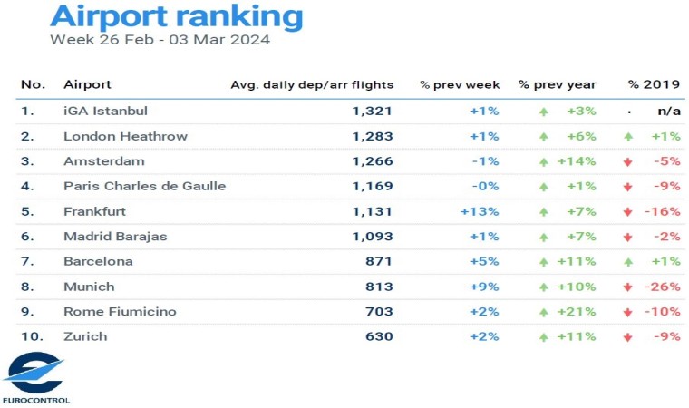 Avrupa Hava Seyrüsefer Güvenliği Teşkilatı EUROCONTROL, 26 Şubat-3 Mart tarihleri arasındaki Avrupa Havacılık Raporunu yayımlandı. Rapora göre İstanbul Havalimanı, bu dönemde günlük ortalama bin 321 uçuşla Avrupa’nın en yoğun havalimanları arasında ilk sırada yer aldı. İstanbul Havalimanı’nı, günlük ortalama bin 283 uçuşla Londra Heathrow Havalimanı ile bin 266 uçuşla Amsterdam Schiphol Havalimanı izledi.