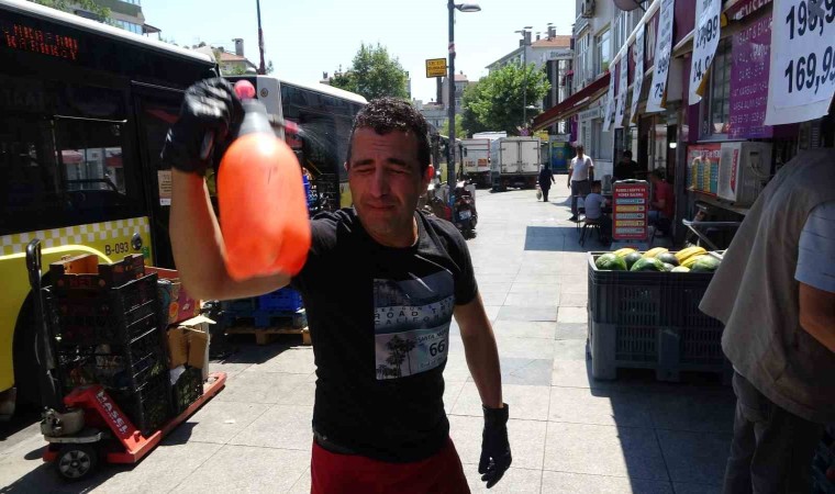 Fatih Kocamustafapaşa’da manav dükkanı işleten Mehmet Şavli, sıcaktan korunmak için hem kendini hem de meyvelerini suladı. Şavli, ‘’Bu sene çok sıcak, bittik, mahvolduk. 10 senedir böyle bir sıcaklık görmemiştik. Meyveler de yandı, biz de yandık. Kendimizi ıslatıyoruz. Meyveleri de yanmasın diye ıslatıyoruz. Yoksa kaynıyor. Sıcaktan meyveler dayanamıyor, çürüyor. Bu sıcaklardan dolayı ürünler de pahalanıyor. Hem ürünler hem de biz yandık’’ dedi.