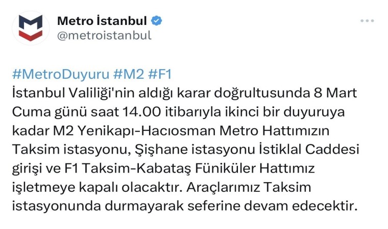 İstanbul Valiliği, Dünya Kadınlar Günü eylemleri nedeniyle saat 14.00 itibarıyla M2 Yenikapı-Hacıosman metrosunun Taksim ve Şişhane istasyonlarının kapatılmasına karar verdi.