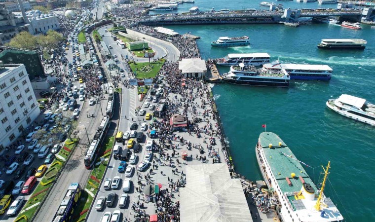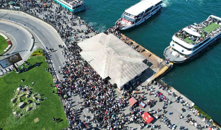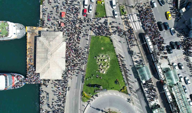 Ramazan Bayramı’nın ikinci gününde İstanbul’da bulunan yerli ve yabancı turistler Eminönü’ne akın etti. 9 günlük bayram tatilini değerlendirmek isteyen yerli ve yabancı turistler Anadolu Yakası’na geçmek ve Boğaz turu yapmak isteyince Eminönü İskelesi’nde yoğunluk oluştu. Vapurları kullanmak isteyen yerli ve yabancı turistlerin iskelede oluşturduğu yoğunluk havadan görüntülendi. İskele önünde oluşan uzun kuyruk ise görüntülere yansıdı.