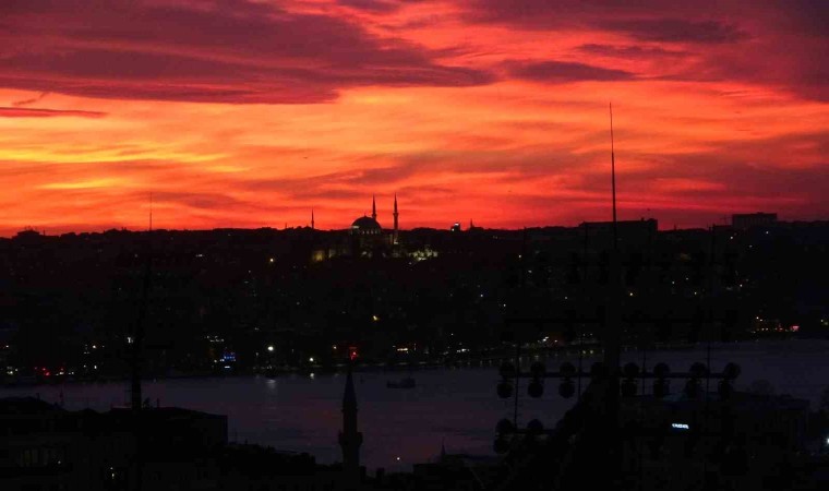 İstanbul’da gün batımında kızıla boyanan gökyüzü ve caminin görüntüsü kartpostallık manzara oluşturdu.